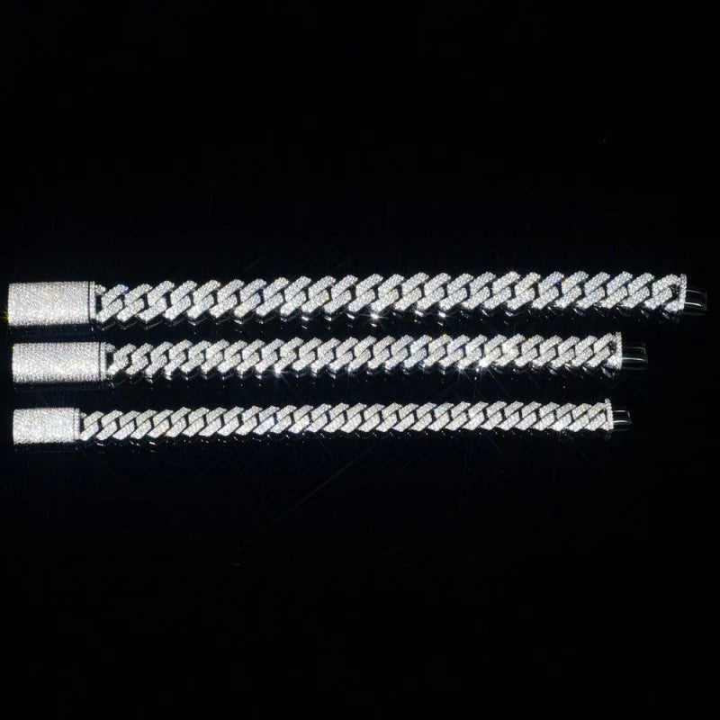 All visible surfaces of the links are hand-set with VVS D-Color Moissanite using dense pavé placement. Stones are seated at controlled depth to maintain an even top profile and help reduce long-term loosening. The dual-row structure distributes weight evenly, minimizing twisting during wear.