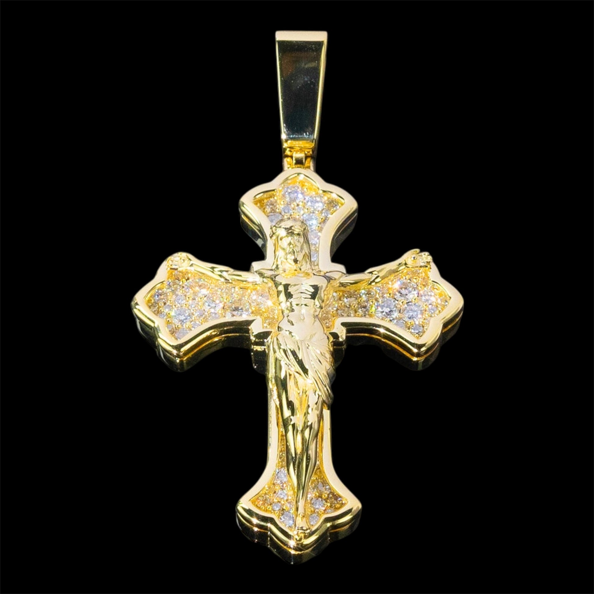 This pendant is constructed in a crucifix design with a raised sculpted figure, integrated into a solid cross base. The cross arms and lower section feature micro pavé–set VVS D-Color Moissanite, seated into recessed channels to maintain consistent stone height and reduce edge exposure.